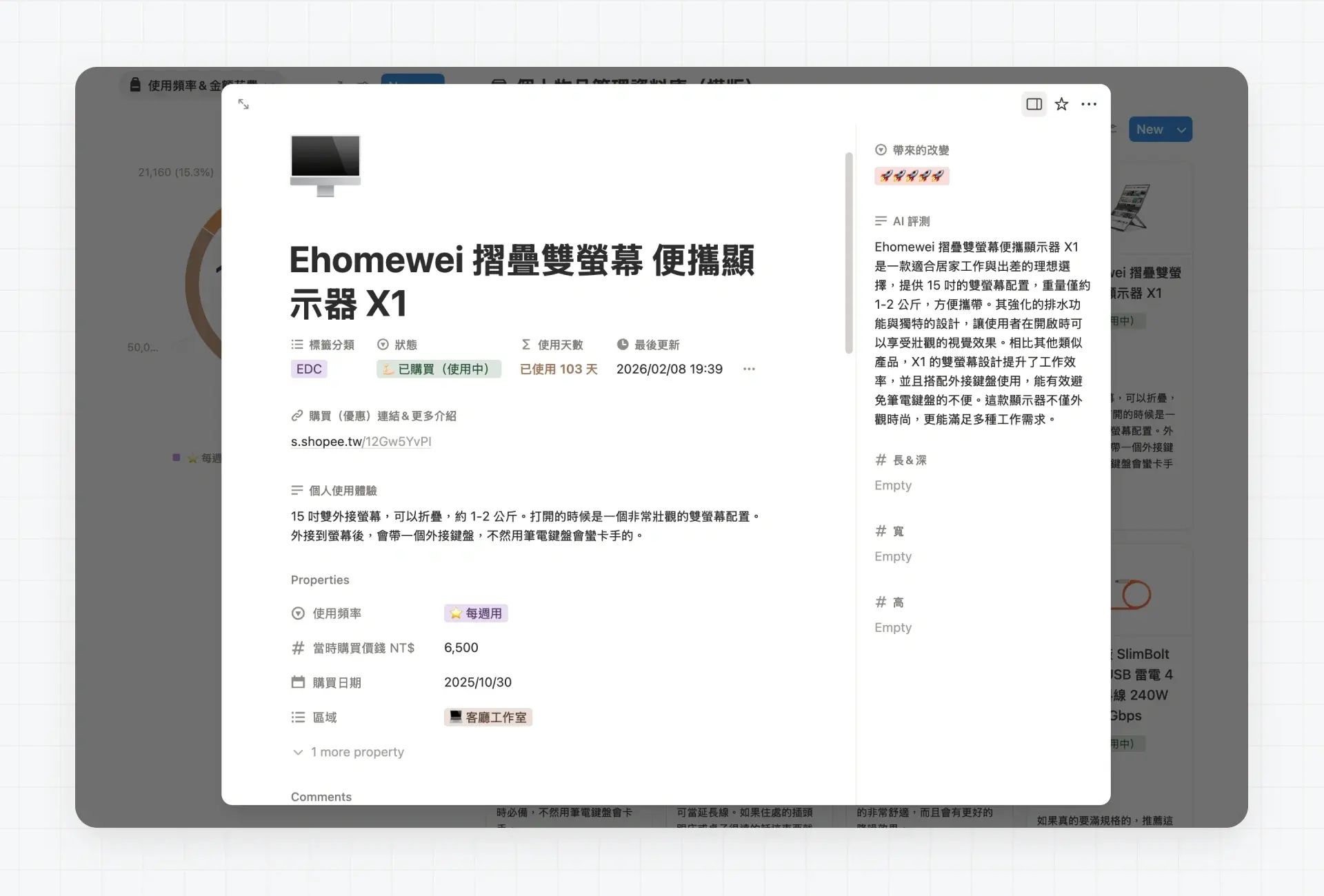 - 物品管理資料庫:記錄名稱、狀態、影響力評分、使用心得、購買連結與價格。
