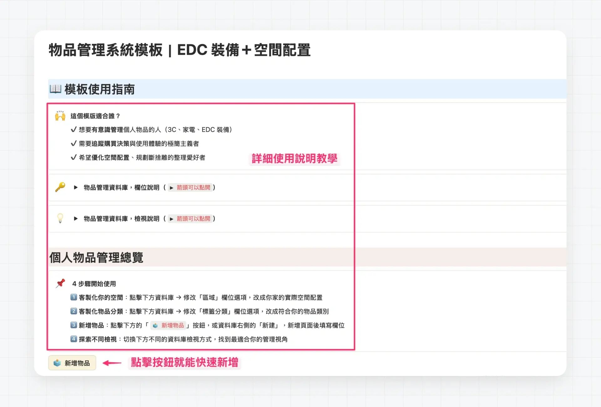 模版內附完整使用指南,從客製化空間區域、物品分類標籤,到新增物品與切換檢視方式,4 個步驟就能打造專屬你的物品管理系統。