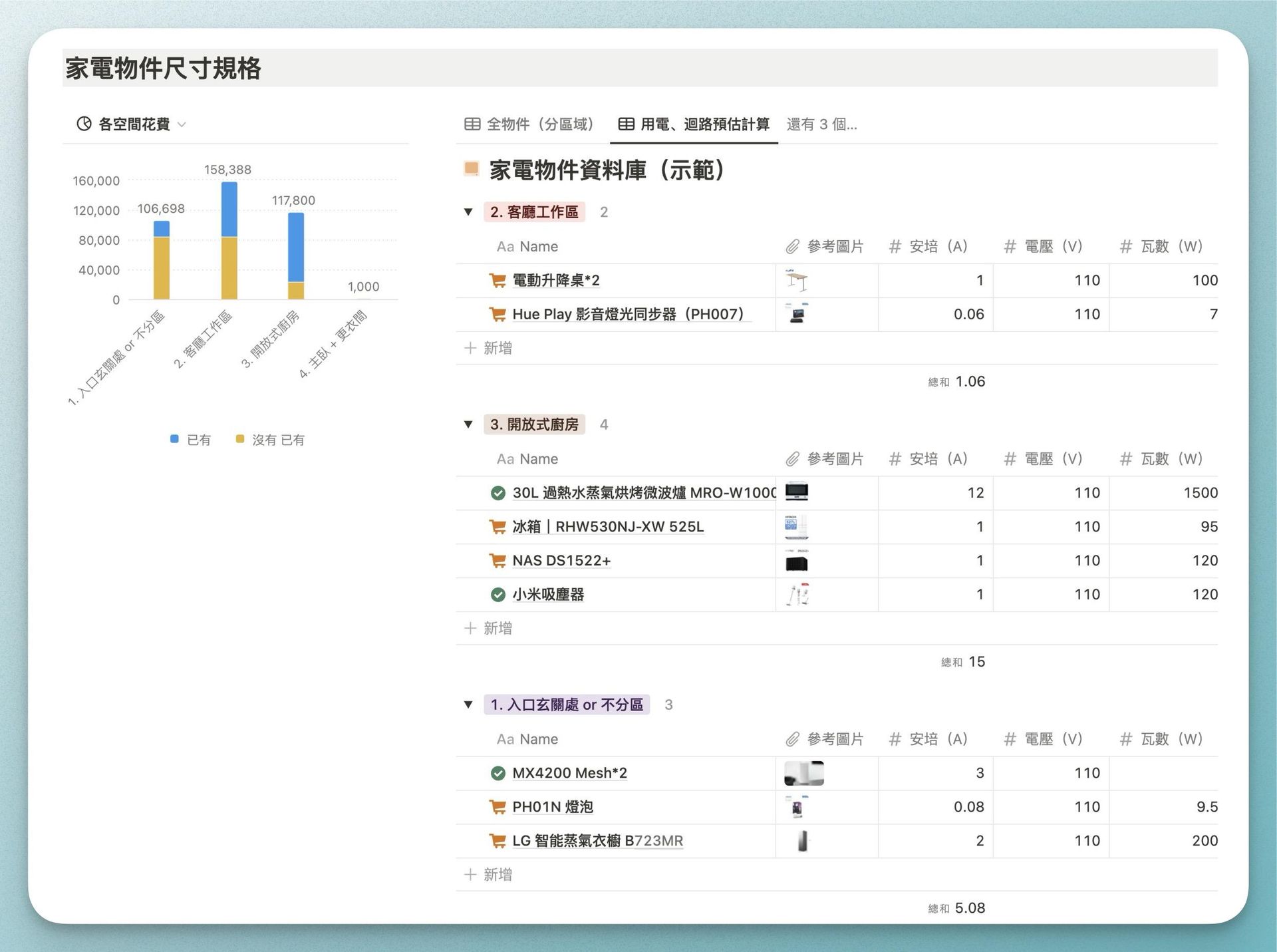 - 家電物件資料庫:列出規格、優先順序、購買狀況、用電量,用來對齊規格和安裝說明之外,把「已購買」家電和「想購買的」物件一併組織管理,我們會知道哪些其實只是「想要」而非「需要」,也能讓自己釐清目前的購買狀態。