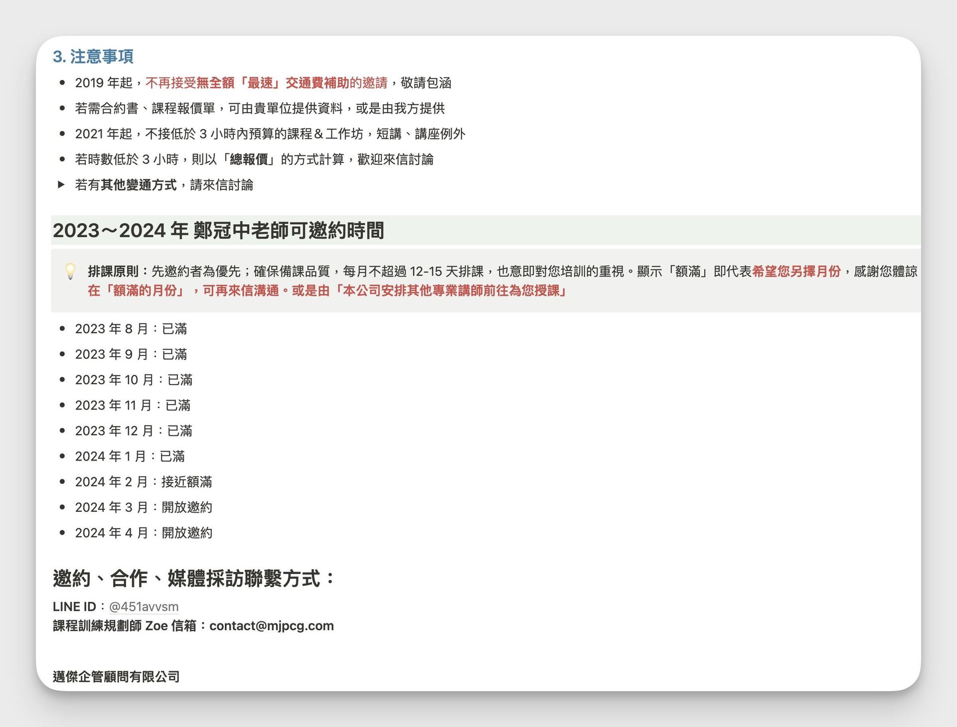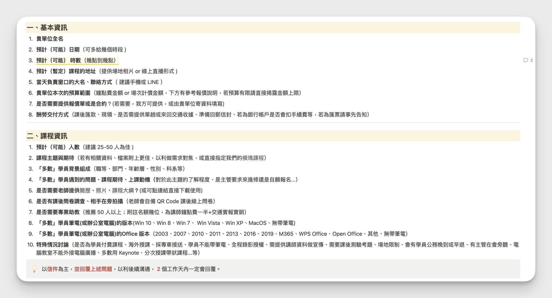- 專業感|讓邀約單位字裡行間感受到你對自己課程的細膩與要求