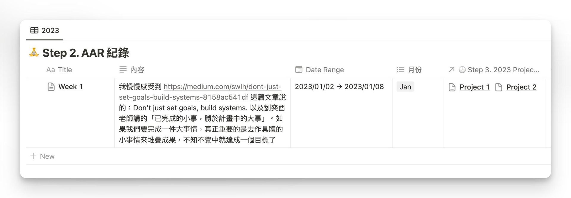 - Step 2:AAR(After Action Review 行動後檢討)紀錄,深度反思上週行動、成就和挑戰,制訂下週方向和行動計劃,透過持續回顧和學習,不斷加速成長。