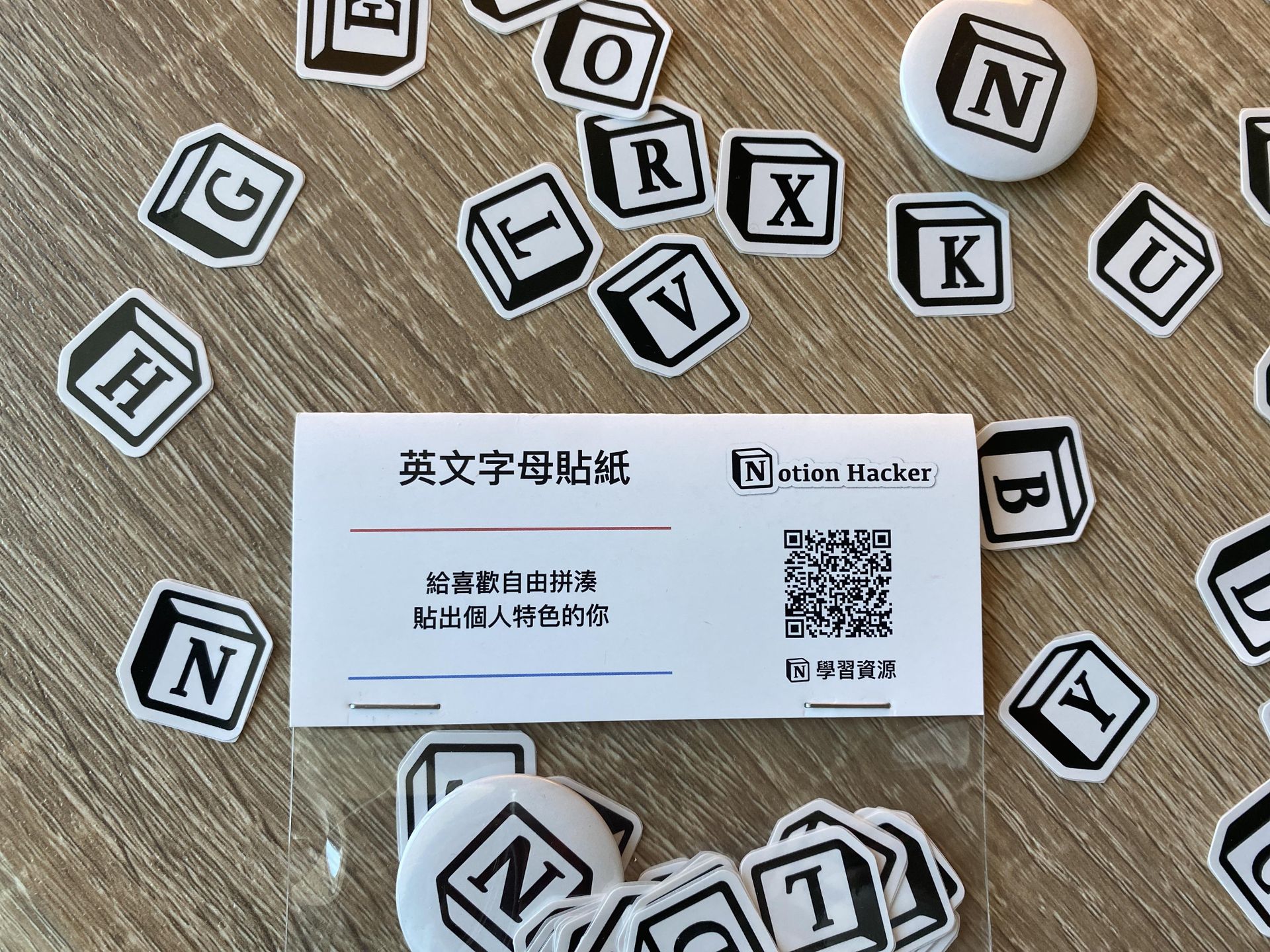 數量:26 個英文字 Notion Logo(直徑 2cm) + 1 個 Notion 磁鐵(直徑 3cm)