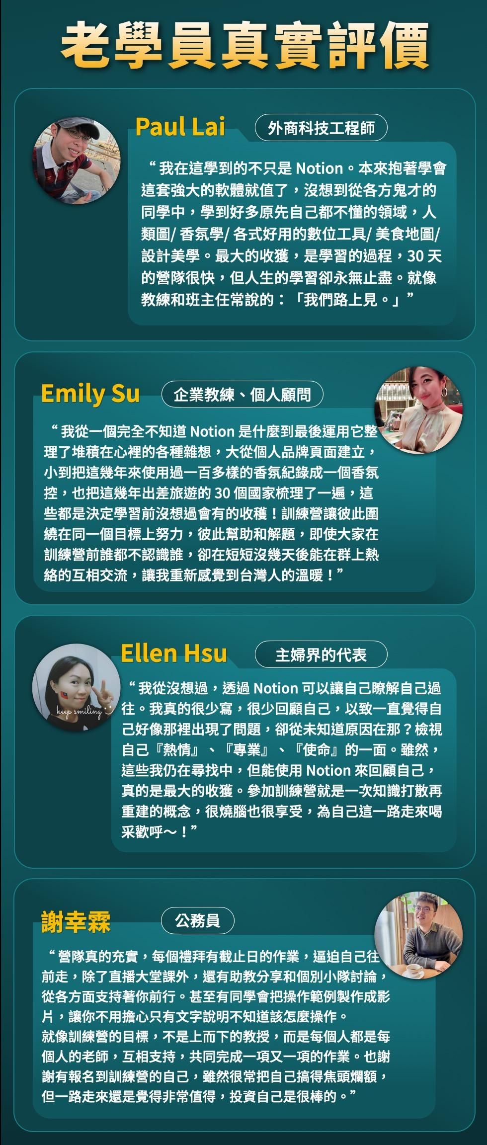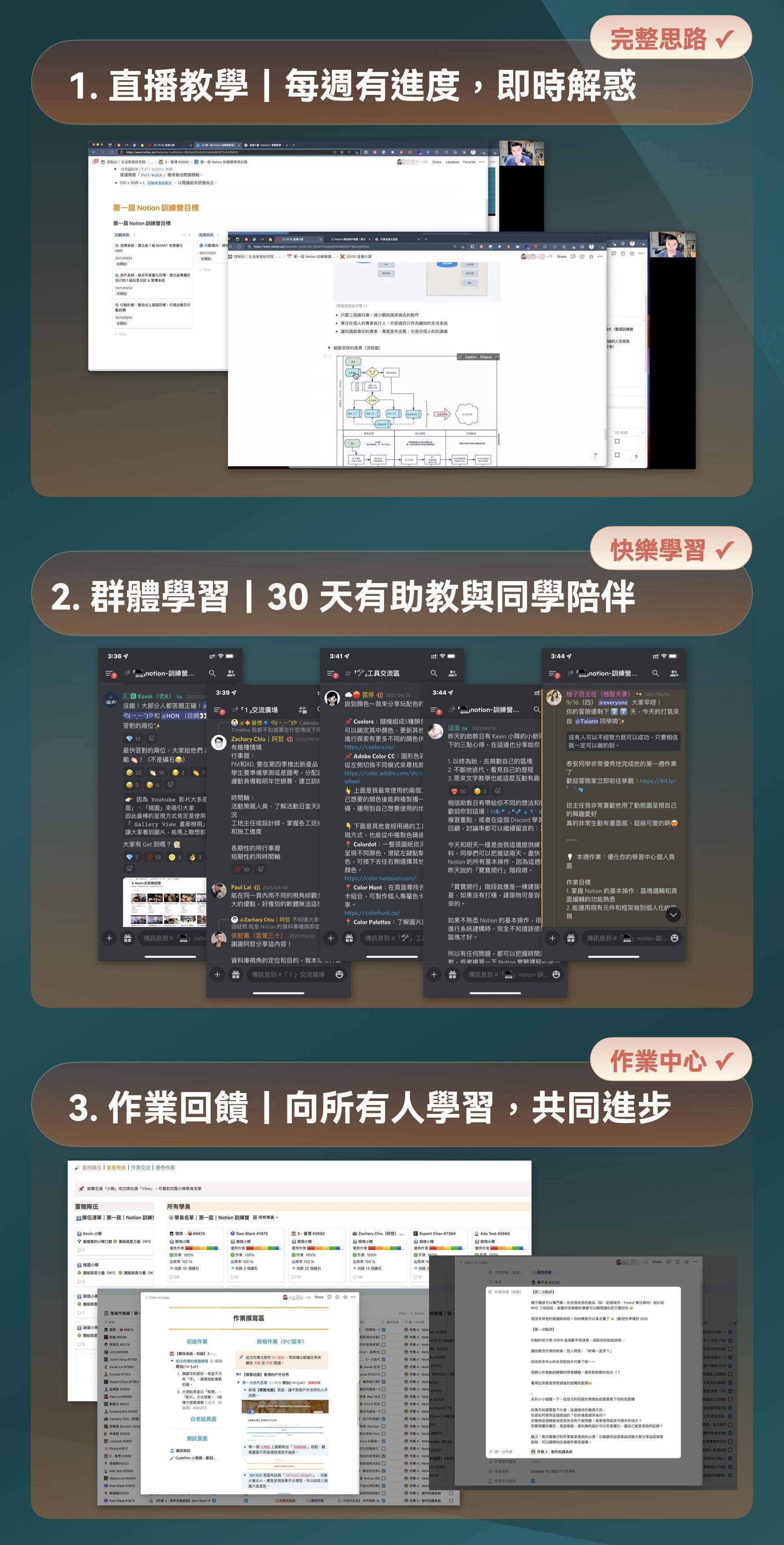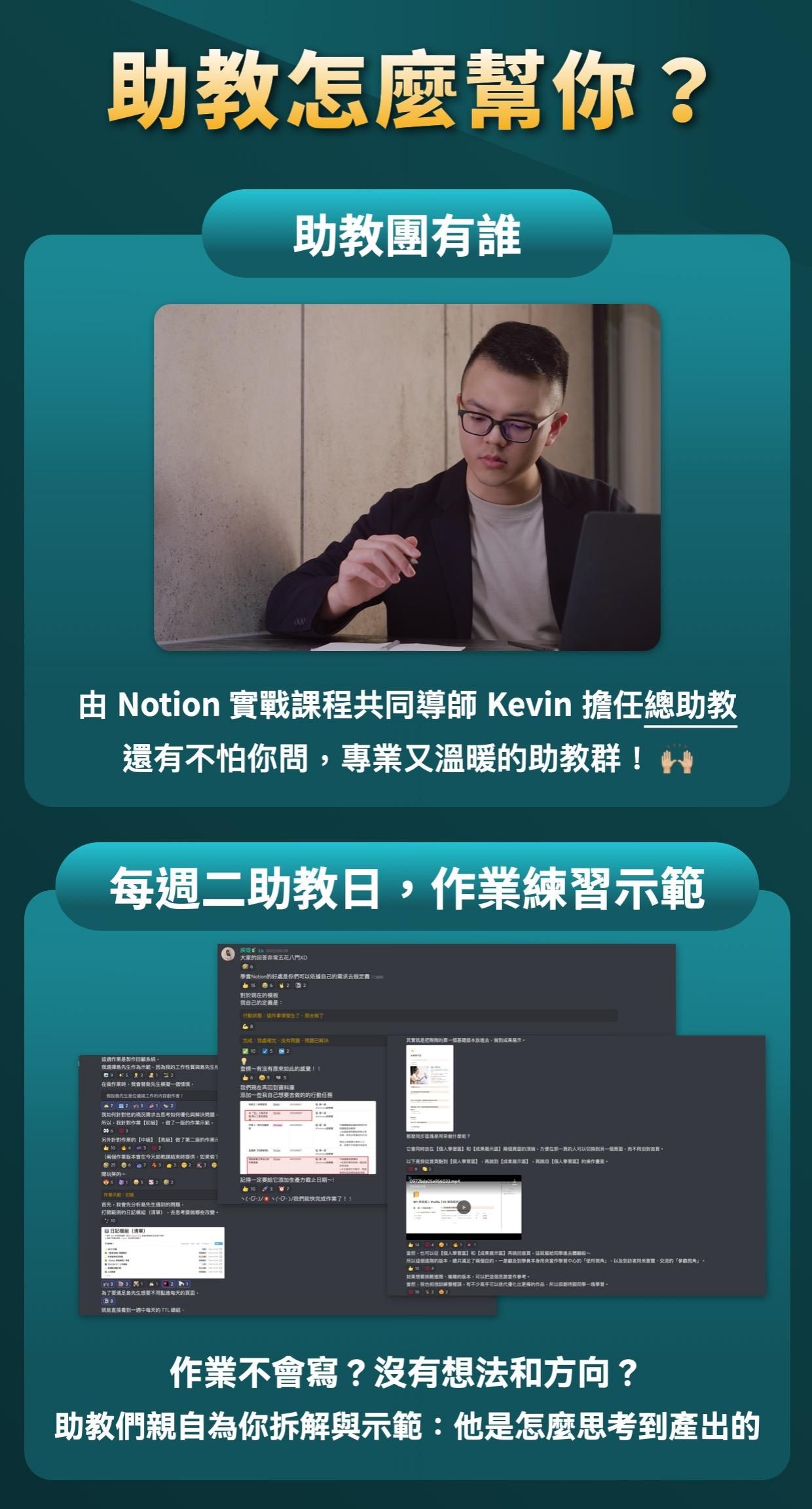 如果是其他章節還沒完全上完,也適合來參加訓練營的!我們在訓練營中,甚至會幫沒有完成影片課程的同學推進進度,一同前行。 - 這個訓練營需要有 Notion 基礎功嗎?
