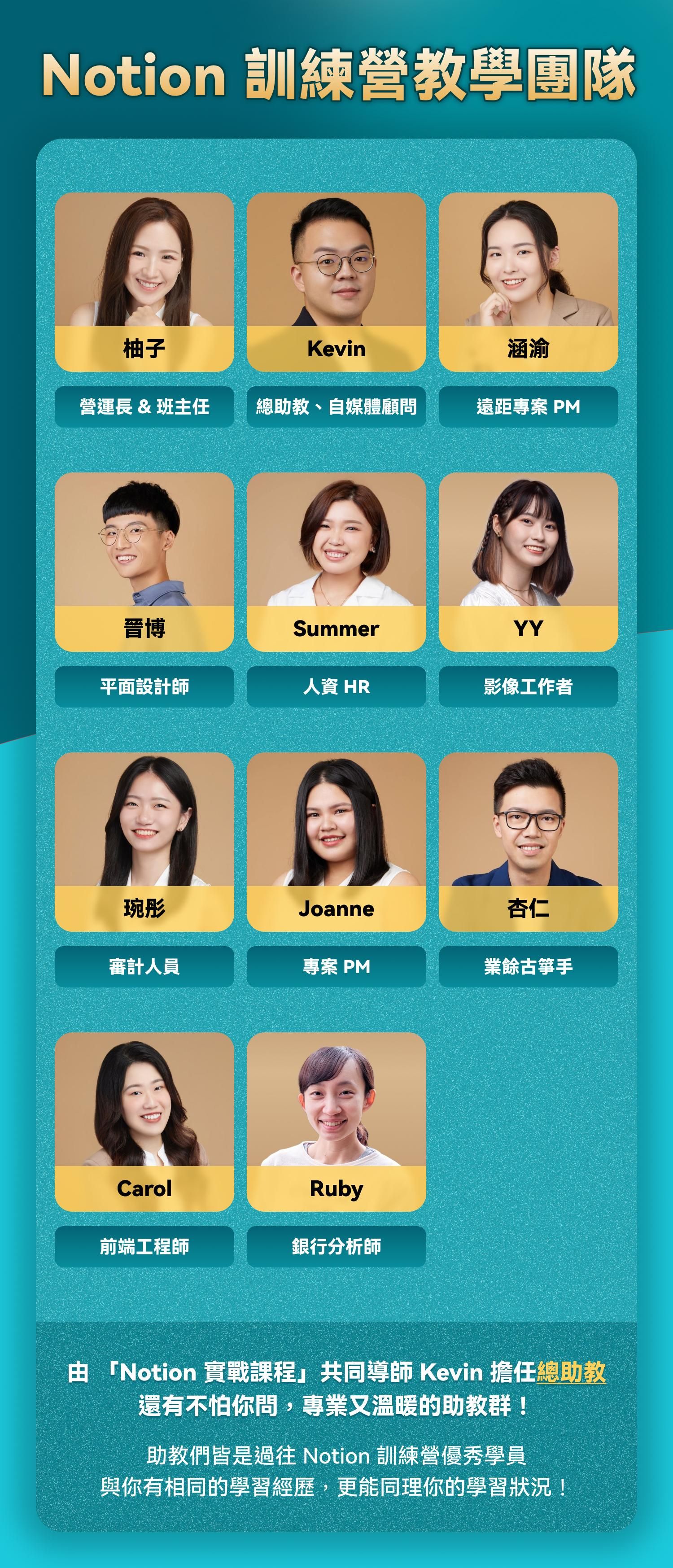- 由於訓練營課程會延續、升級【Notion 實戰課程】的內容,甚至需要運用到課程中提供的付費資源、模版和理論概念,我們會在訓練營期間配合每週進度,帶你有效學習完線上課程的內容,所以報名訓練營一定要備著【Notion 實戰課程】哦!