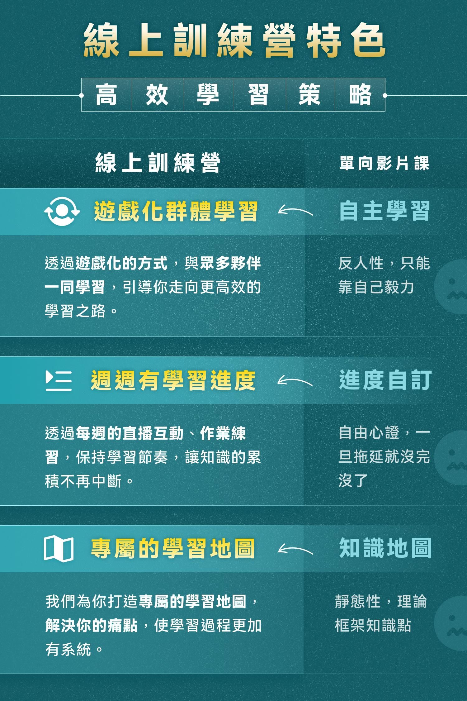 線上實戰訓練營,是我們從 2020 年推出一個新型態的「線上學習 3.0 模式」,不只是把實體課程的學習體驗搬到網路上,而是強化「課後的陪伴式支持服務」,也就是說,我們不會在直播課結束後就不理你,反而提供專門的課後社群可以隨時讓你提問,你也能看到所有當屆學員的作業練習和製作思路,讓你「不只是向一個老師學習」,而是跟所有人學習。