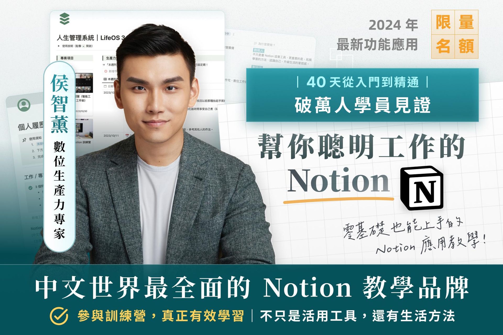 Notion 線上實戰訓練營,為期 40 天(2024/03/21 - 04/30), 包含超過 10 場直播教學,每週透過作業實際練習,還有小隊助教全程輔導,讓每一個人都能從 0 開始,打造屬於你自己的 Notion 系統和數位工具——升級你的時間管理、知識管理和人生系統;就連三個孩子的媽都能掌握,你怎麼可能不行? 🤘🏼