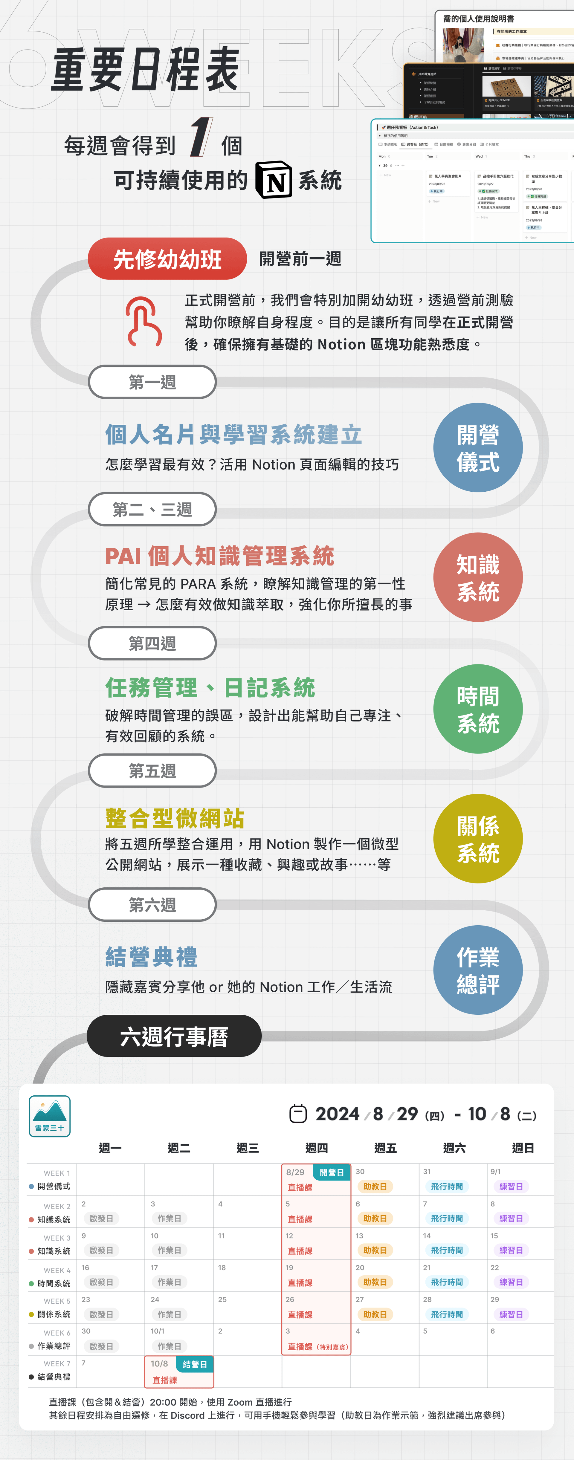 - 直播上課 + 案例解構:7 場線上直播課程(每次約 2 小時),完整看見系統建立過程、Notion 使用技巧和思路,並即時互動解答你的疑惑;超過 10 種應用案例解構,不會只給模版,而是讓你理解底層邏輯,從中學會打造自己的系統、模版。