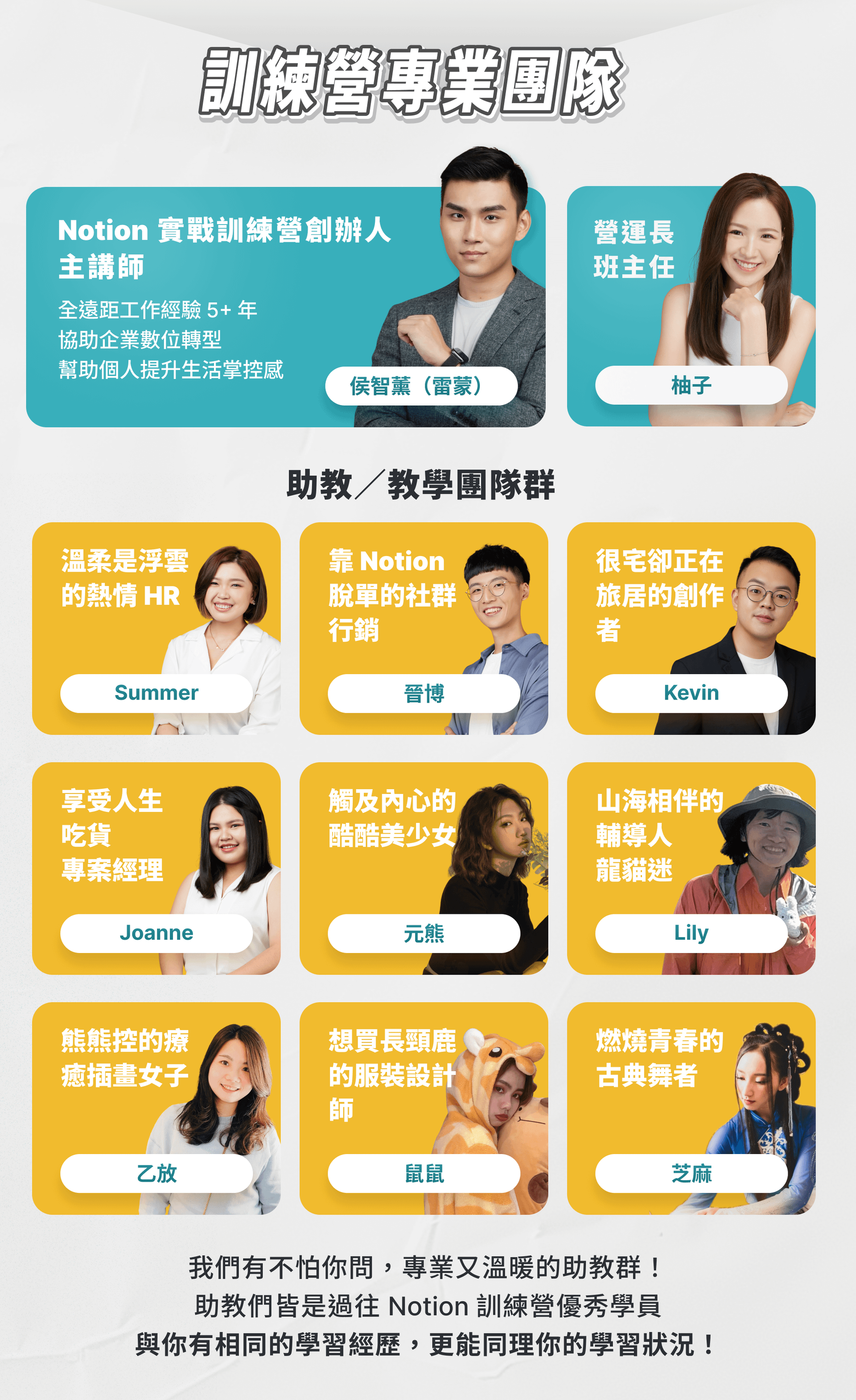 - 歷屆訓練營學員在社群媒體上分享的心得(你也可以直接搜尋「Notion 訓練營」,找到他們的真實評價和故事)