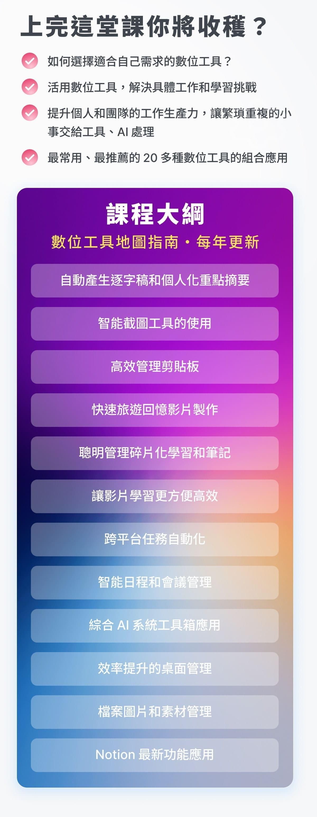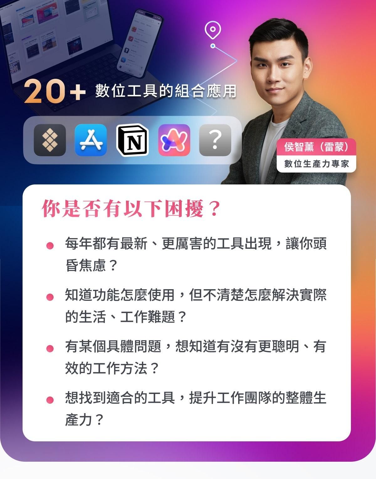 - 終生學習者:需要管理大量學習資源和筆記的你,這堂課將教你如何有效整合學習工具和資源,使學習更高效。