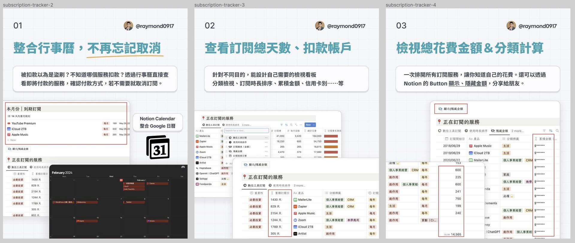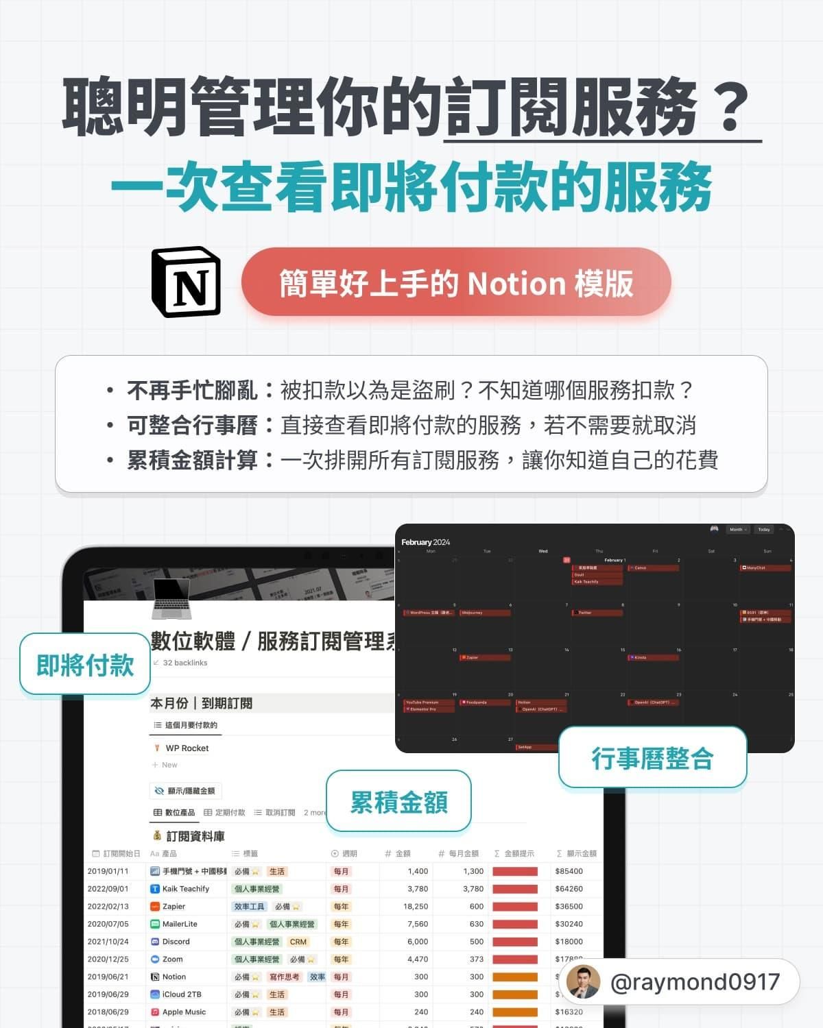 這個 Notion 模版(訂閱服務&數位軟體管理系統),幫助你: