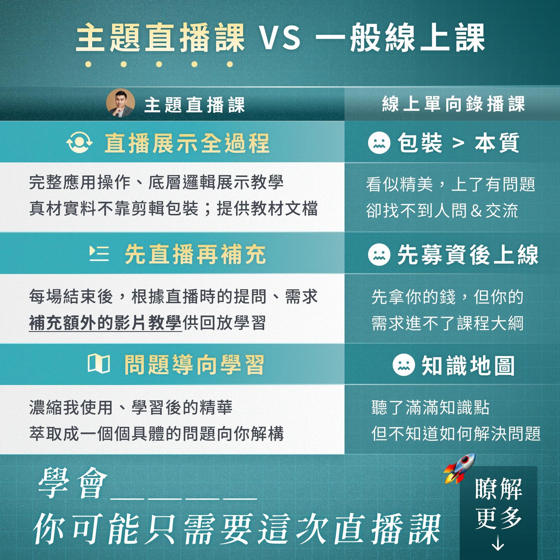 有別於市面上冗長、包裝厚實的預錄後上線的課程,我會分享我最新的實際應用,並且盡可能不會過時的底層操作邏輯;