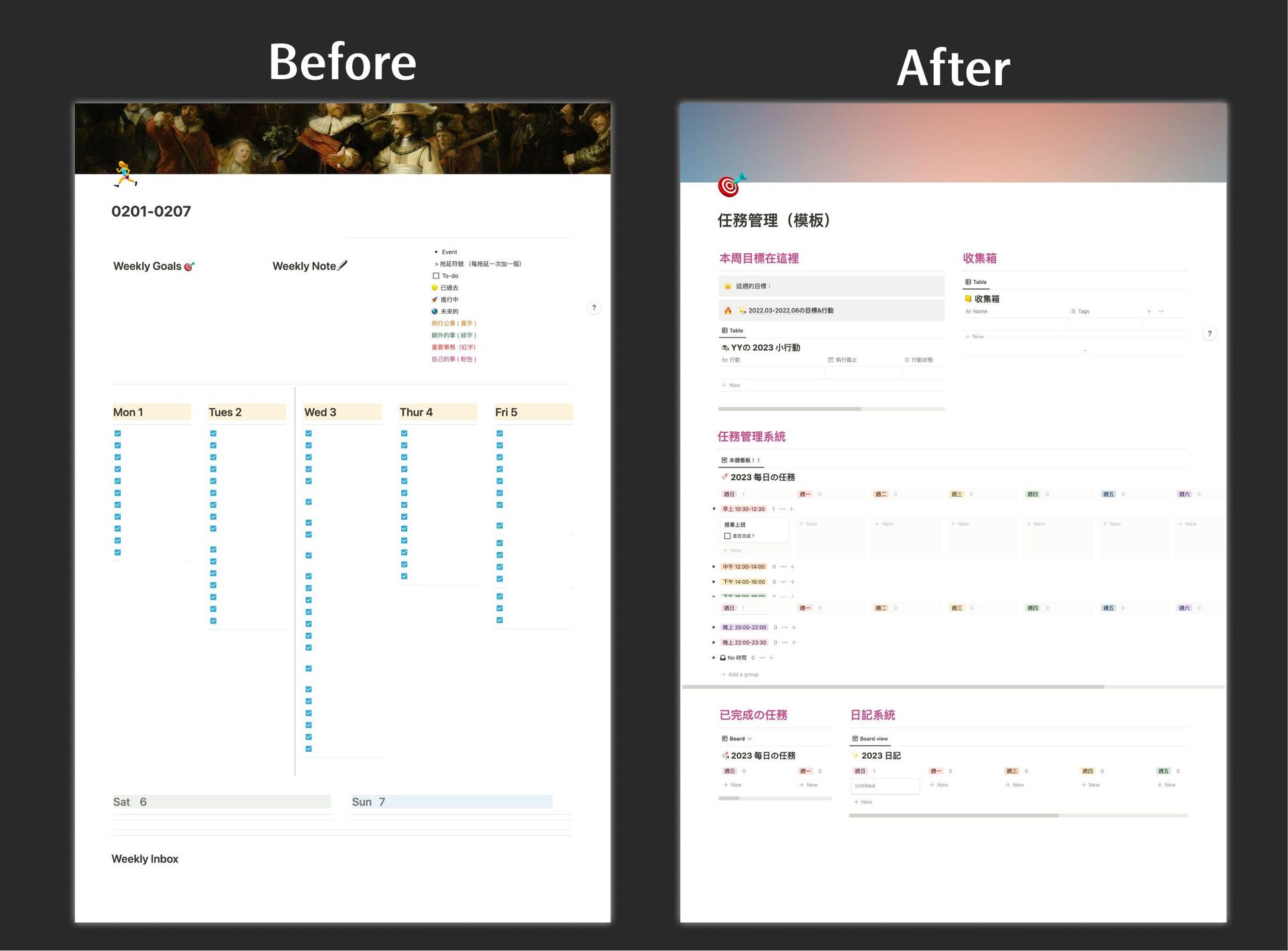 - 融入 OKR 系統:盤點手上有多少專案(工作影片、自己的頻道、學日文、運動閱讀等等)先確定有多少大的目標 (Object),再把所有任務(Key results)分配到每週的任務中,讓自己每天都有朝目標前進一點的感覺